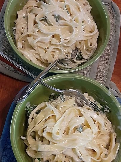 Speaking of slurping… I made a yummy fettuccine recipe using spinach and green herbs from our garden: garlic chives, green onion and basil. Here’s the recipe: