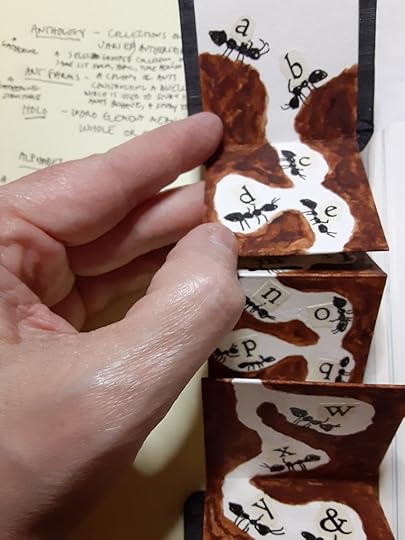 Ants are making progress… in my new artist book that is! In my last post I was working on “Ant Hology” using a collage of letters, ink and gouache. It’s another miniature 2 inch square book that opens to 20 inches long. Here’s the progress: