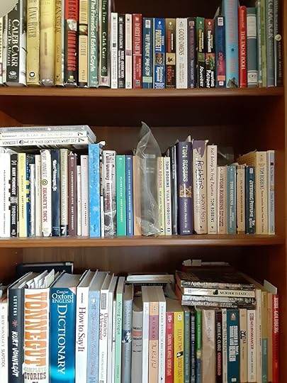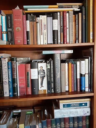 Anyway, becaus we can’t really live in rage let us now go to our happy places … the bookshelves in our living room are one of my favorite places s. Sometimes I like to just look at the shelves and what’s on them.