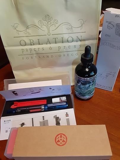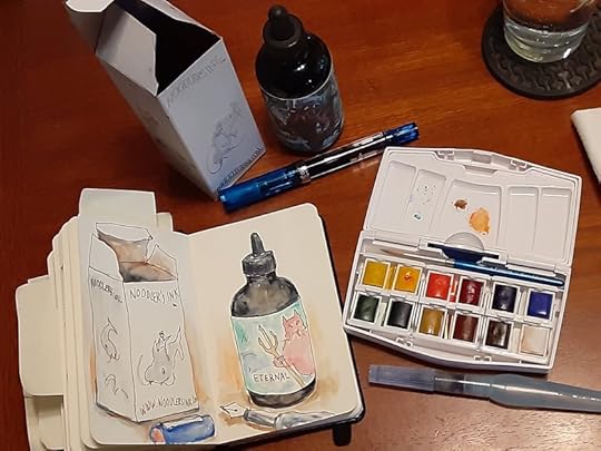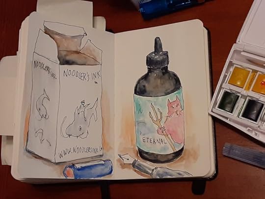 I’m still mostly having a break from blogging and social media: Last week for my birthday my spouse and I went to Oblation Papers in Portland Oregon https://www.oblationpapers.com/ where, one of their knowlegeable staff, directed me to the TWSBI ECO fountainpens with their high volume ink chamber!! I also got a new Noodlers Ink called “Heart Of Darkness”! Won’t it be fun to make my whimsical art from this ink of Darkness?! We rushed home where I immedately filled the new pen and drew in my sketchbook!