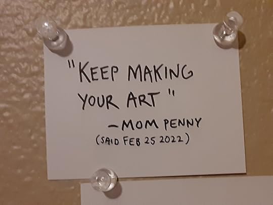 I’ve shared it before but this thumbtacked note on my studio wall containing what Mom said in one of our last conversations bears repeating … she said it in her authoritative Mom voice too! Mom had worked as a psychiatric nurse and she always placed a high value on self-care, especially upon mental health self-care as a way to foster good relationships with yourself and other people, self-care as a lens through which to view one’s choices of activities. When I was younger and Mom learned – before I realized it myself – that drawing and writing were some of my main ways to self-soothe whenever I was upset she would gently direct me towards pens and paper.