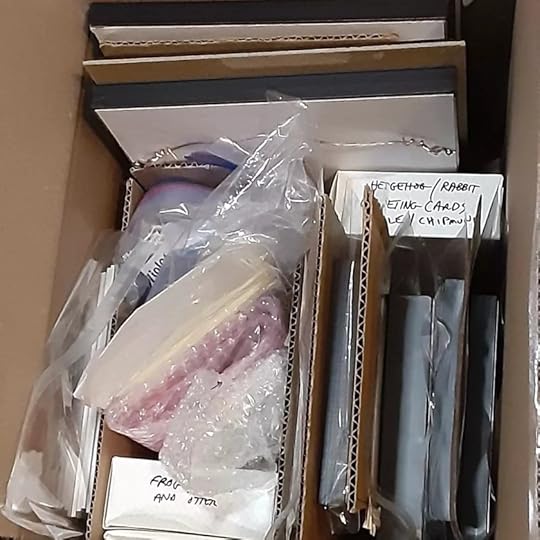 Besides fine art and artist books there are also limited edition greeting cards… the art, books and cards all relate to each other… anyway here’s a photo of the box of 90 pieces of art. Many of the artworks are the size of an open hand or smaller. It was nice to just carry one 11 x 11 x 14 inch sized box into the Gallery! I’m telling you I’m totally sold on the miniature art genre!