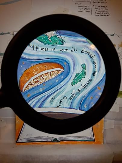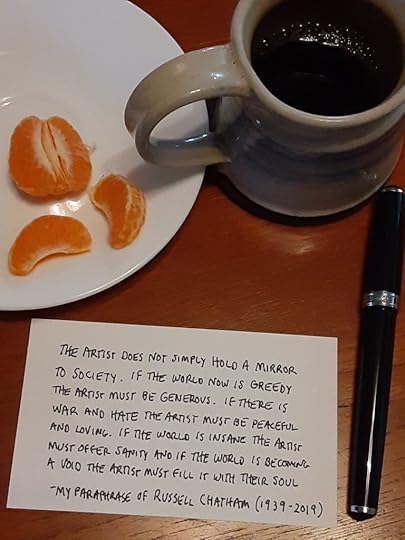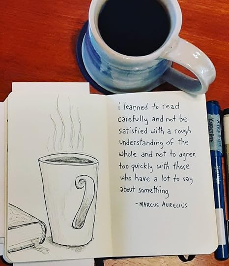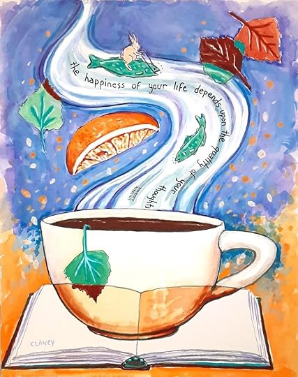 This week was … there. Reading Marcus Aurelius helped. So did the oranges, the coffee, the leaves in the yard, the books and art. Talking with my spouse helped too. I kept returning to this quote from Marcus Aurelius so I did this gouache and ink painting. Then I added it to my “for encouragement” art print series on my Society 6 shop.