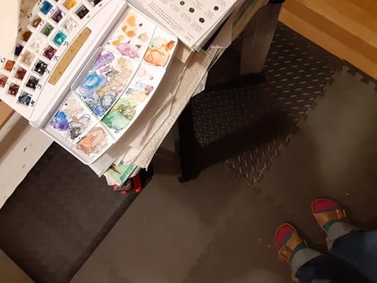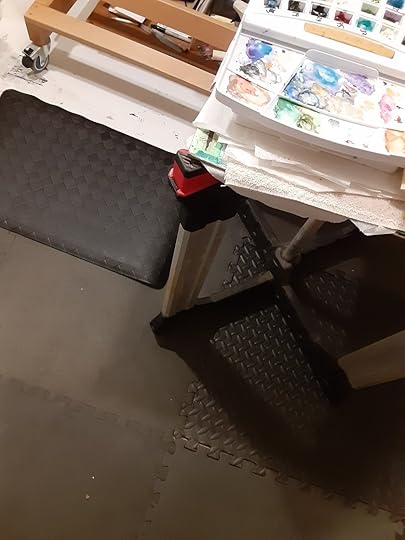 So when a nice surprise from Storyberries came I used the windfall to get some anti fatigue mat flooring for when I’m standing at my easel and moving about my work area. It has the added benefit of protecting the wood floor! And….