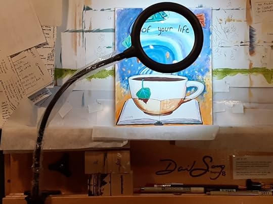 I’m sure you’ll recognize one of the dog paintings on my easel. The other dog you’ll probably see next Monday. And I’m sure you’ll notice my new magnifying glass (last post) in use!