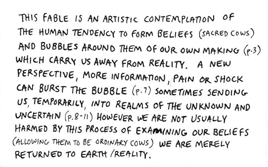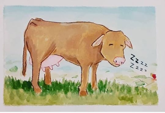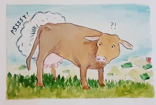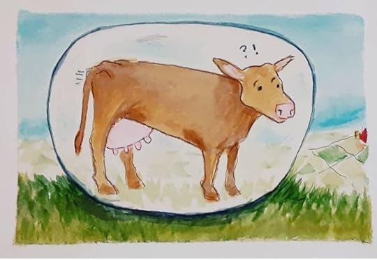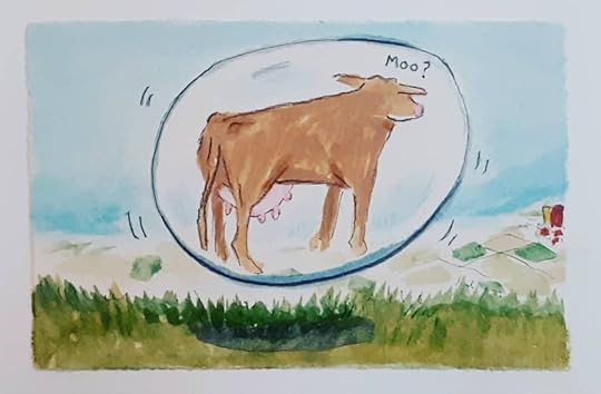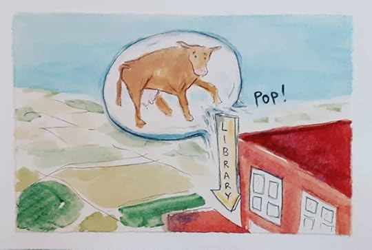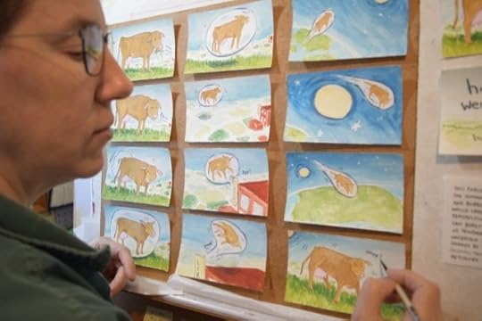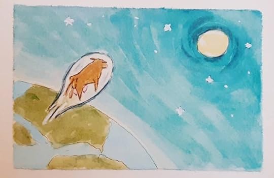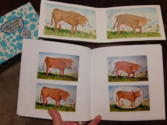 Thus I’ve been pondering just how it is that Mother Goose’s cow went over the moon. And our human habit of having sacred cows… beliefs that take us into the stratosphere away from reality. Consequently there’s a new wordless book in progress on my easel.