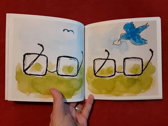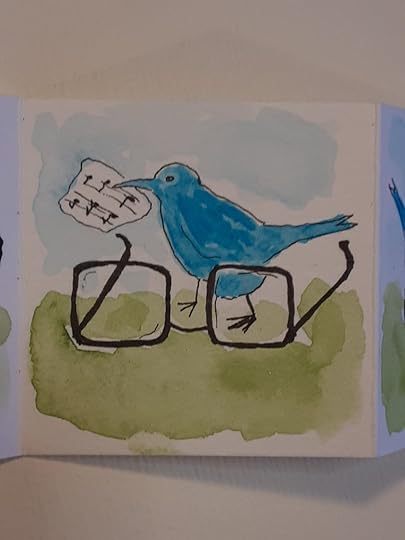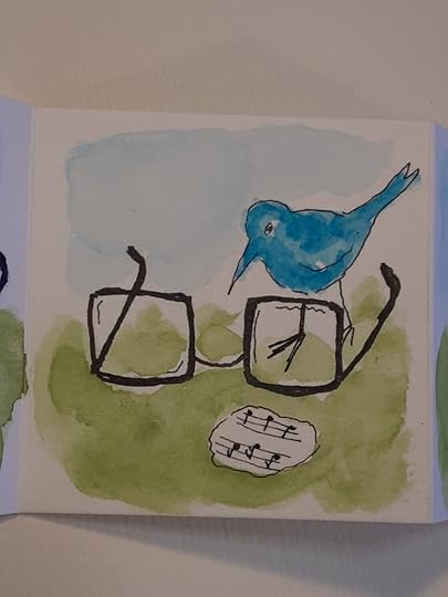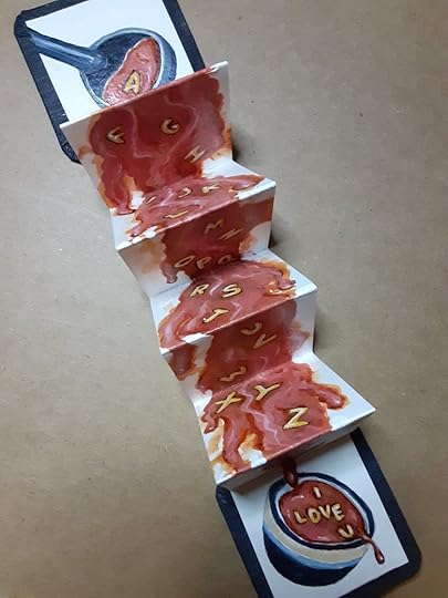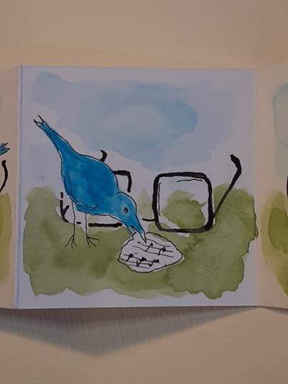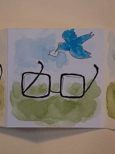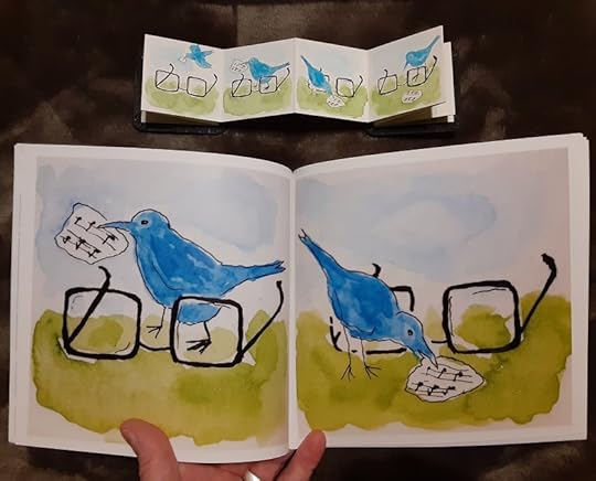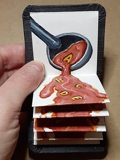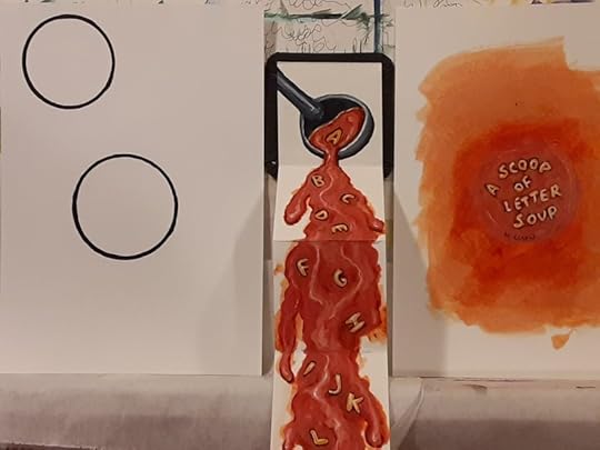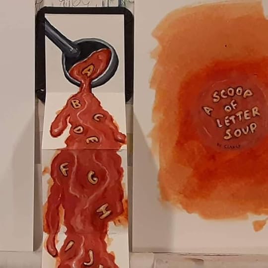 Progress is happening on a new experimental art book for Storyberries! It’s a wordless visual poem about letter soup with only 10 panels plus front and back covers. 12 images total. Ink, acrylic and gouache are my art methods on another 2 inch square concertina zig zag folded book. I focused as I mentioned last post on rhythm, repetition and surprise. It will be a challenge to talk about this poem on this blog and on my social media without giving the poem’s punchline away immediately before Storyberries has a chance to distribute it but I’ll do my best.