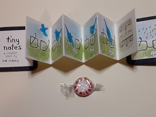 For example: as I’ve been making the digital files for the printed book (and for Storyberries) I took the photos below of the handmade books with a piece of candy to show scale. I did this because it might amuse readers to see the original books in the printed book version. And perhaps help the younger readers be aware that books are made by people just like them.