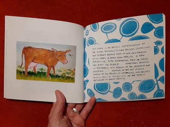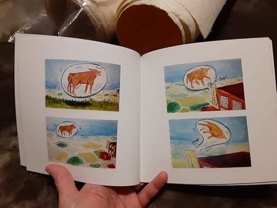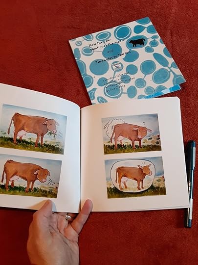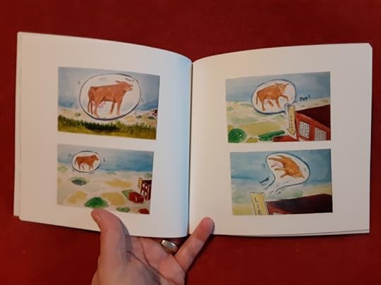 The artwork in the cow story is just a bit smaller in the printed version than the original. But as you can see the colors are a very close match! Also the printed book is conventionally bound so I set up my layout like a comic book rather than in the folded concertina form of the original. I don’t yet know of any printer who prints and mails concertina style books. The two illustrations per page layout allowed me to fill the seven inch square printed pages. (In the photos below the original handmade book is at the top)
