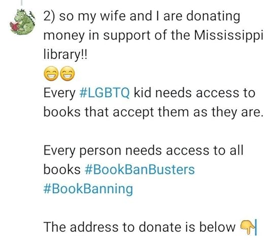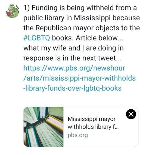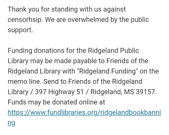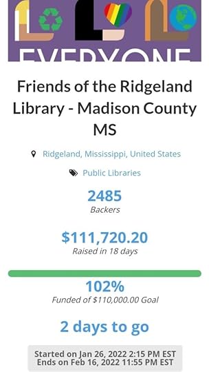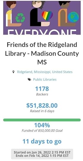 The Mississippi library mentioned in my recent post whose funding was taken away because the town’s mayor objected to LGBTQ books has met it’s fundraising goal several times!! Celebrating this success!! Up to the minute details are here.