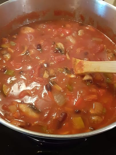 So I made a big pot of vegetarian chili and we settled in to read! Here’s the recipe I used https://bluejeanchef.com/recipes/black-bean-mushroom-chili/