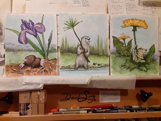 In the studio I’m working on a fine art reproductions project that I can’t talk about much yet. But I’ve discovered another side benefit of working smaller- doing 6 paintings at a go, working in groups of 3, is more easily done when they’re smaller! Working in groups also lets me coordinate colors more easily! Who knew?!