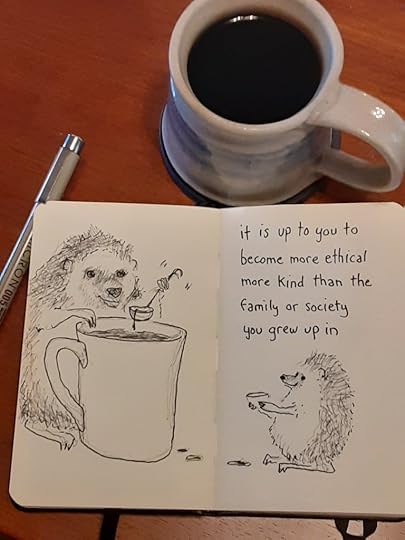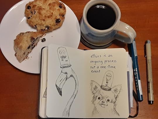 As you may remember I’ve been reading “The Annotated Arabian Nights” by Horta and Seale most evenings. I’ve been struck by how much the book talks about being true to yourself – accepting that you’re “bent” in your own ways- while also being an ethical contributing member of a community. So I’ve been pondering ethics in my sketchbook.