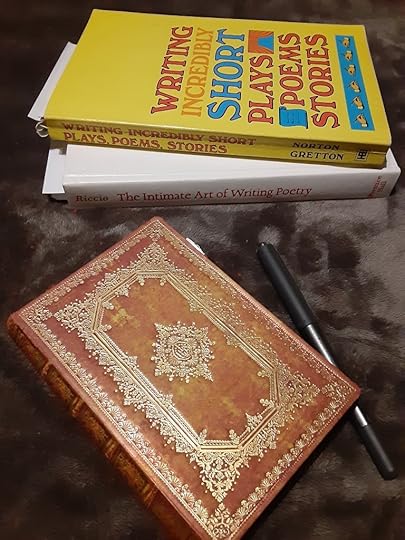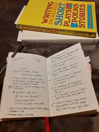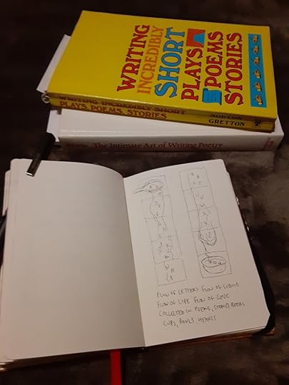 Speaking of sketchbooks and reading: I feel a sense of urgency to create more books for children that are “artsy” and perhaps a little “different” from the usual kids books. So I’ve been reading about poetry in two books: “Writing incredibly short plays poems stories” by James H Norton and Francis Gretton and “The Intimate art of writing poetry” by Ottone M. Riccio. And I’ve been brainstorming in my poetry sketchbook (the orange book in the foreground) some visual poem ideas for my new “experimental art book” category on Storyberries.