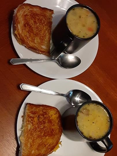 We had mugs of soup with a grilled cheddar cheese sandwich split between us. Yum!
