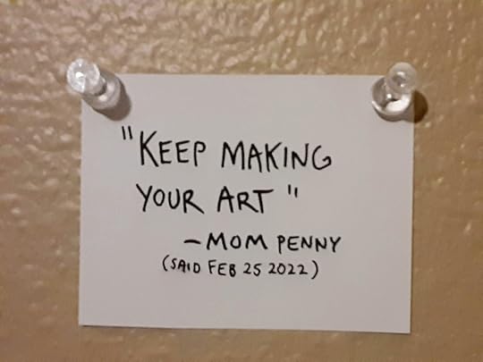 Besides the visit from a great friend this week my wife and I talked by phone with my adopted mom and big sister! Mom said she’s proud of me and that I’m to “Keep making art”! Big sister agreed! So I wrote the exact quote of Mom’s on a card and thumbtacked it to my studio wall just above the light switch for the room. That way I will always remember!