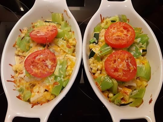 Besides wrapping burritos in foil and baking them as per the recipe above I had a craving for some roasted vegetables. So I made my bean, onion and cheese burritos and put them in some boat shaped ovenproof dishes. Then I covered the burritos with chopped zucchini, corn and bell peppers that I tossed in Penzey’s Northwoods Seasoning mix. A few slices of tomatoes and shredded cheese completed the dish. I covered the boats with aluminum foil and baked them in a 350 degree oven for 20 minutes. Then I removed the foil and used the broil oven setting to toast the cheese. With hot pads on the table I served the boats directly from the oven. So yummy!!