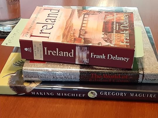 My “garbage time” evening reading is: Ireland by Frank Delaney, The World Of Edward Gorey by Ross and Wilkin, Making Mischief by Gregory Maguire.