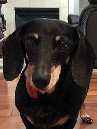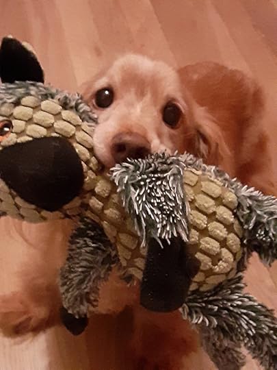 Now about the holiday box project: as I mentioned in my last post the Caplan Art Designs Gallery is asking us artists to wait to do social media about our box work until after early November. So I’m waiting … While we wait here’s my studio supervisor dachshund with a fuzzy toy.