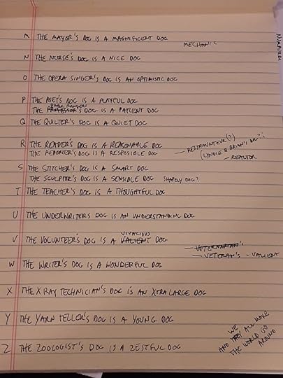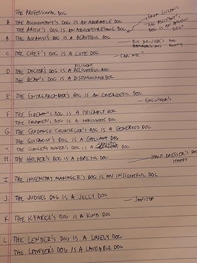 I’ve been thinking of the 19th century parlor game called The Minister’s Cat and have been updating that game idea with a variety of professions and dogs. All of this is so I can play with my adult friends and together we can entertain some kids.