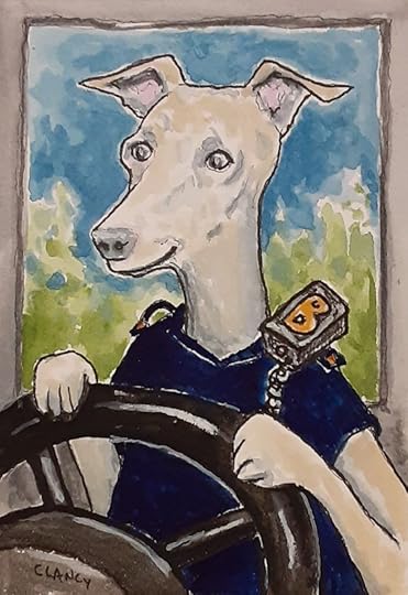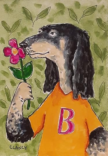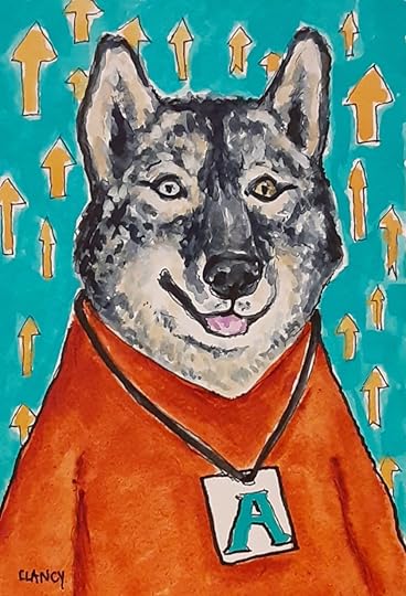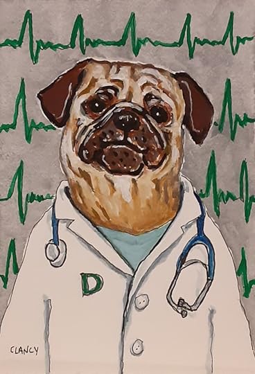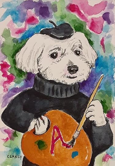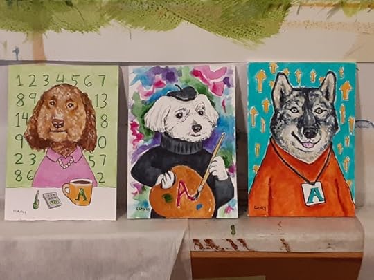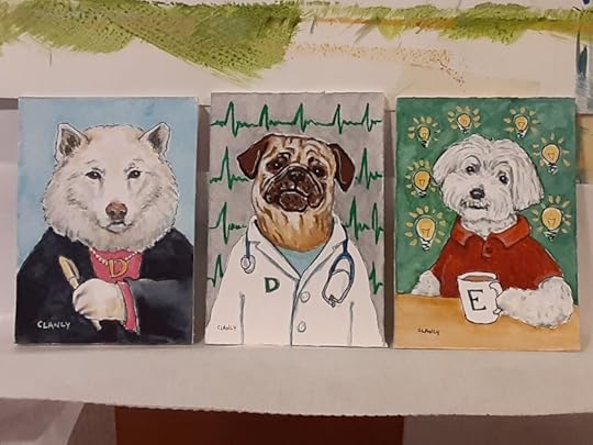My childrens book The Professional Dog progresses along! Below are three in a row. Do you see how the colors in one piece leads to the colors of the next? For example the background color on the left dog becomes the shirt color on the middle dog… My use of color is one of the ways I am planning the pages to flow from one to another in the book. The original portrait is done on board and will be framed as fine art.