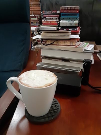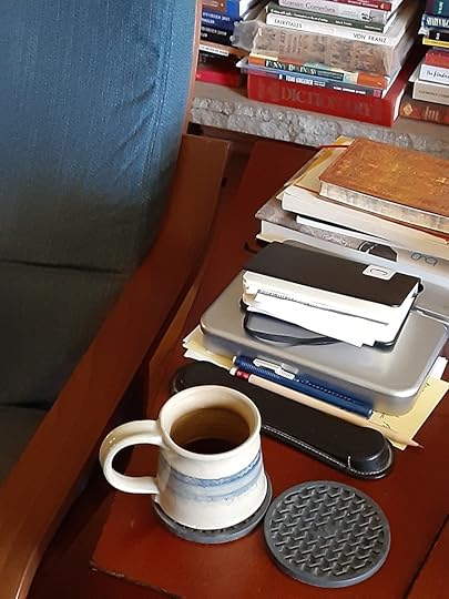 Temperatures here in the Pacific Northwest are now cool to cold as the sun goes down so my reading evenings often have hot chocolate or hot tea to go with a book. Last night as I returned to my chair I thought “this is one of my happy places” so I took a photo.