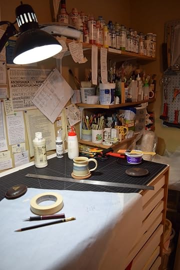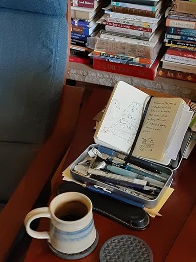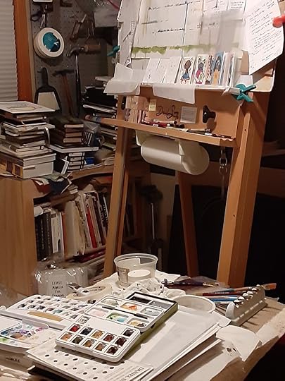 Here’s a look at my art studio – I have small sketchbooks and a box of pens that travel, like my coffeecup, between rooms of my house and outdoors to the patio. Then there’s a room that has all of my art supplies including my art easel – in the photo you can see my work on The Professional Dog on my easel.