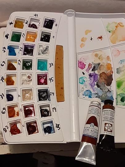 Here’s a look at the finished art. I used my new butterfly palette that I’ve talked about in a prior post. These colors are literally based in scientific studies of butterflies and other bugs. It was fun to paint winter scenery using the butterfly colors! The color palette you see in this photo is what I call my “butterfly box”.