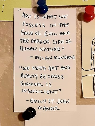 … one of the things I thought about is this: It feels urgent to me to practice patience and to encourage decency as much as I can. The selfish meaness of a small group of people during this time in U.S. history is toxic. The majority of people are generous and kindhearted but I see the kind people, particularly my friends in the medical and teaching professions, being worn out by the few meanies. Sometimes even I feel worn out. So I have taken it as a creative challenge to do whatever I can to give the kind people a bit of care. Yes, my attempts to give care via art sometimes feels small, it feels like trying to refill a dry lake by the teacups full. But art is what I can do. And I do firmly believe this quote on my studio wall pictured below. Art is all we have. It’s certainly all I have.