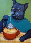 The next day I went over my notes and began making 4 x 6 inch size thumbnail sketches. Over several weeks I did this; going over my notes and photos, drawing possible poses of the cats, possible objects, considering composition and colors. I also showed my sketches to Judy discussing the possibilities. At one point Judy said that they had both talked of Nova Scotia, Newfoundland and Hawaii enough that she was sure that they were important. I agreed and adjusted my drawings so that a reference to those travels was emphasized. Slowly an idea began to come together in the small thumbnail size anyway. What works visually at a small size doesn’t always work at a larger size but it’s a place to start.