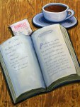 A Novel Morning – One of my favorite things to do is to go to Powell’s bookstore, find a new-to-me novel and then get something in the café. The “text” in this painting is re-combined and paraphrased from “Death at La Fenice” by Donna Leon.