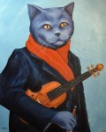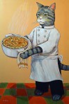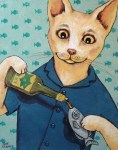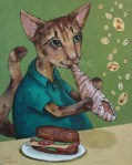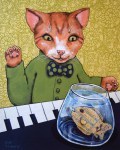 Amongst all these thoughts I had my cat’s exhibit open at Burnt Bridge Cellars. One of the benefits of doing one-person shows is that I get to see a years worth of my own work all at one time. As I looked around I realized that I’ve focused on creating my characters; the eyes, the fur, their animal-body-shape in people clothing and not as much on the stuff, the objects, they hold.