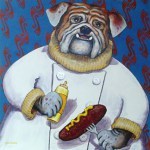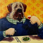 And below is one of my artwork, titled “Massive Mastiff Munching” that flowed from the above sketchbook page and other pages like it. For example I’m also combining (as documented in other sketchbook pages) the “tapas”, or small plates, way of eating that many places offer – including the winery mentioned in the above sketchbook page.