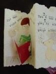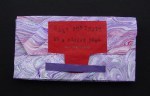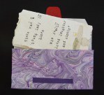 Artist statement about the work: By personifying herself as an open book – (or more precisely, as the linen thread binding the books within this book) – with original limericks and pop-up book elements the artist pokes fun at self-styled “moral” groups who personify inanimate objects; books, movies and other art objects by describing them as “immoral”, “wicked” or “sinful”. By writing “clean” limericks the artist is poking fun at the idea that a poetic form like a limerick could be defined as a “naughty” art. An object or art form is just that, an object or technique – what people do with it may have a good, bad or neutral effect. But even the effect depends on the viewer’s perspective. Thus “Self Portrait as a Wicked Book” is enclosed in a hand-marbled envelope – implying that the contents could be hidden from view, that the viewer has a choice to view it or not. The book is intended to be displayed accordion style so that the viewer can see it from different angles of their own choosing. The textual reference within the limerick to “overblown” refers to the ways self-styled “moral” groups would ascribe moral qualities to the entire personhood of an author as a result of one written object the author had created. The content also refers – both textually and by using colorful marbling and pop-ups – to the ways that censorship (or a “wicked” designation) actually increases interest in the object banned.