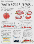 There’s a kitchen-skill being taught (“how to roast a pepper”) and then there’s a recipe that applies that skill. (The “Please-ya Burger” recipe also uses the kitchen-skill “How to peel and roast garlic” that I’d illustrated and shared on my last blog post here.)