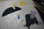 At this point I’m cutting and gluing together all of the various shapes from the various “base” papers to form the overall characters and aspects of scenery. With an Xacto knife I cut the needed shape positioning it using tweezers. Then I would adjust the position – often several times – before gluing it together. Then I would press the glued papers flat and let them dry.