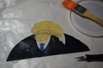 I pre-planned for how the various shapes “wrap around” the 4 edges of the board. This way the judges bench actually looks/feels like a 3D bench. All we don’t see are the witness boxes. The flag extends to the side and top edges of the painting. The judge’s arm continues on one edge. As you can see in the photo the floor extends over the bottom edge.