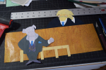And so it goes – back and forth – building up each element in both 3 dimensional space as well as 2 dimensional. For example, the watch in the Schnauzer’s pocket is a complete watch – with numbers on it – even if you don’t see all of it in the finished artwork. Behind the suit coat lapels is the entire vest… the tie actually fits under the white shirt collar. The flag is several different colors of paper pieced together and actually hanging from a pole (a cut piece of gold paper). If you could tell the Schnauzer to move over you’d see the entire “bar” he is standing in front of and behind those is the entire “bench” on which the Labrador judge sits.