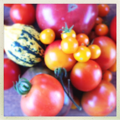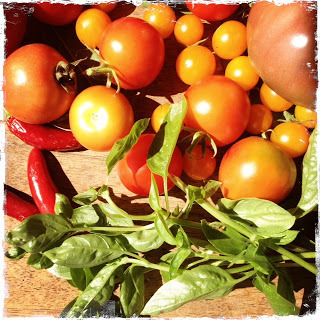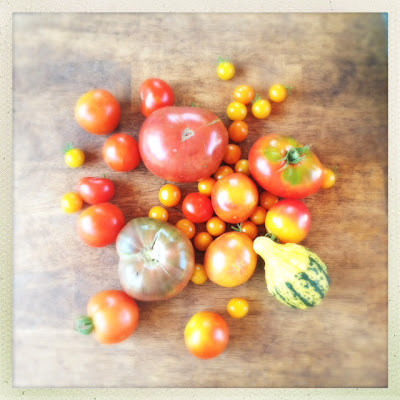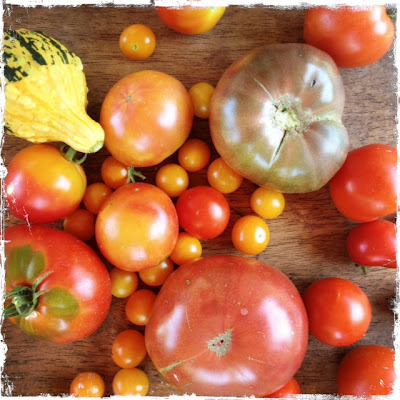 Last year we barely had a handful of tomatoes. This year we've had a luxurious abundance. Some have gone into salads, others into pizza and pasta sauce. The little yellow ones get eaten right off the vine. So sweet!