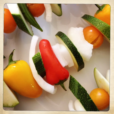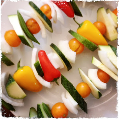 We did brochettes on the BBQ last night. Home grown zucchini with mini peppers, onion and cherry tomatoes.