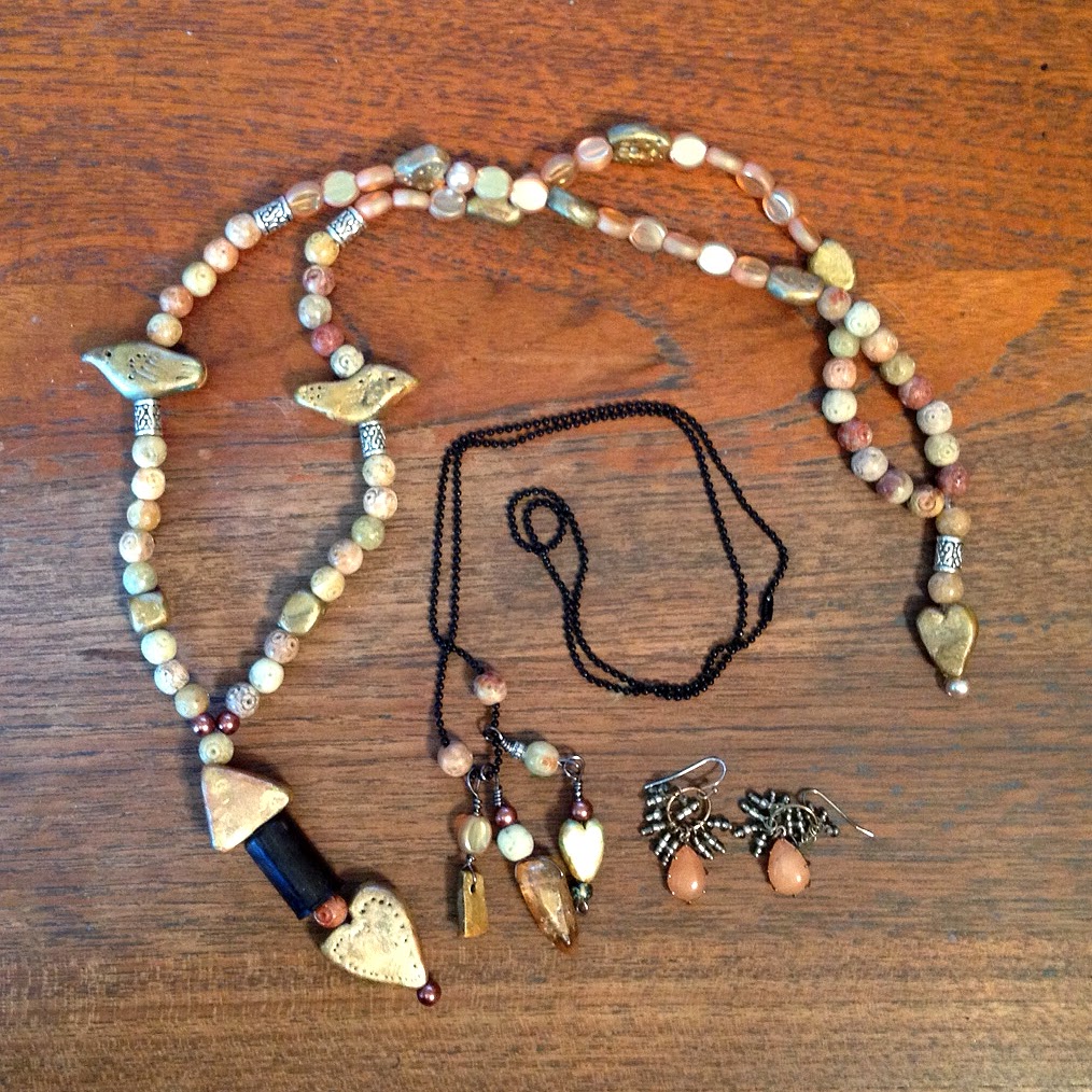 Here is a little pendant I made. I molded the bird and heart from baked clay then textured them with gold paint. I've put some of my "makings" up for sale in my etsy shop.