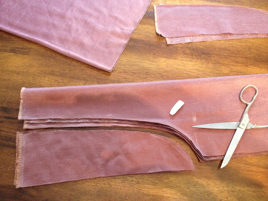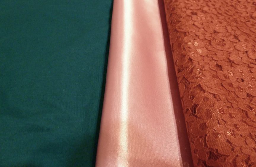 These are the three fabrics that I ended up buying teal knit for a top, pink satin to make my mom a pillowcase and a yard of paprika colored lace to use for trim.