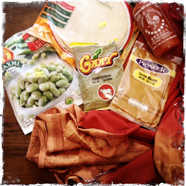 I went to Little India with my friend Aleta yesterday and picked up some delights. We both love to cook so it was a treat to just wander through all of the spice shops and small groceries. I bought Rooster sauce, chapati, garum masala, lovely fennel (so fragrant), broad beans and a used sari from the thrift store.