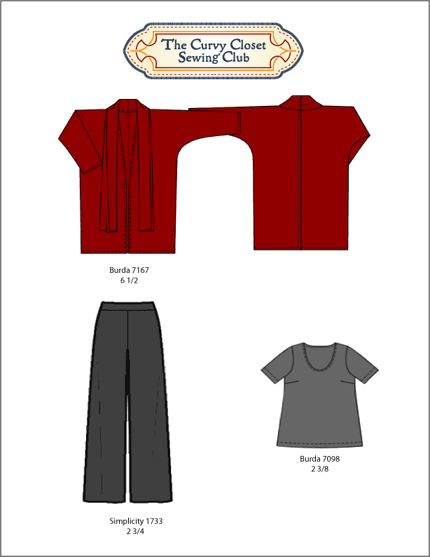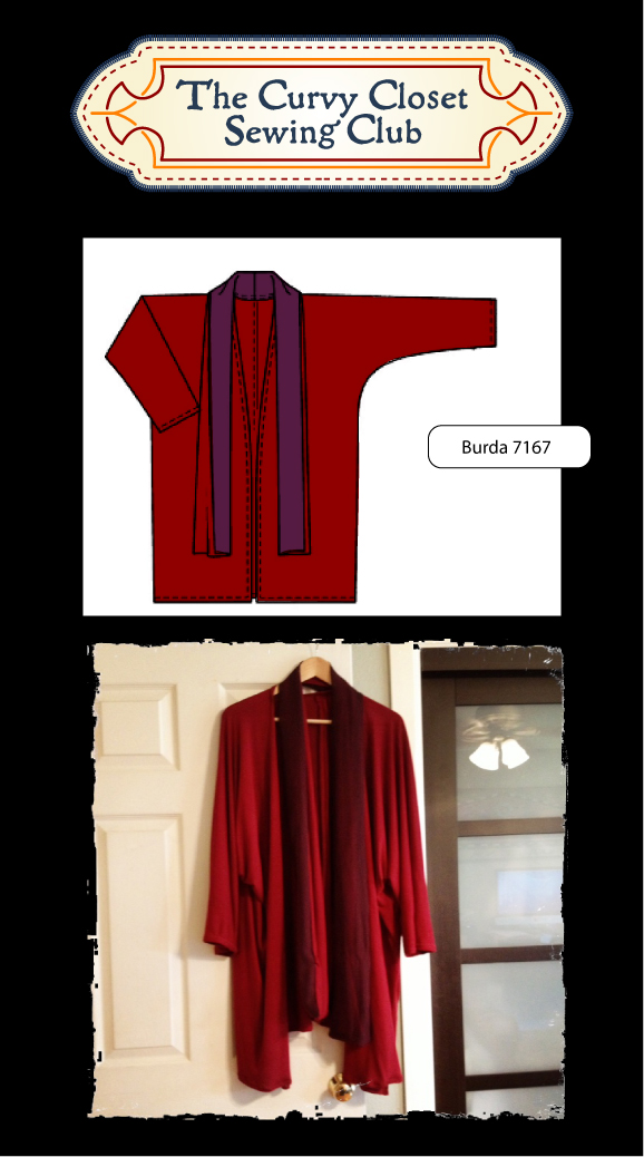 I made this yesterday, a long knit lightweight jacket in cranberry with plum voile trim. Snazzy! Bring on the cold weather.