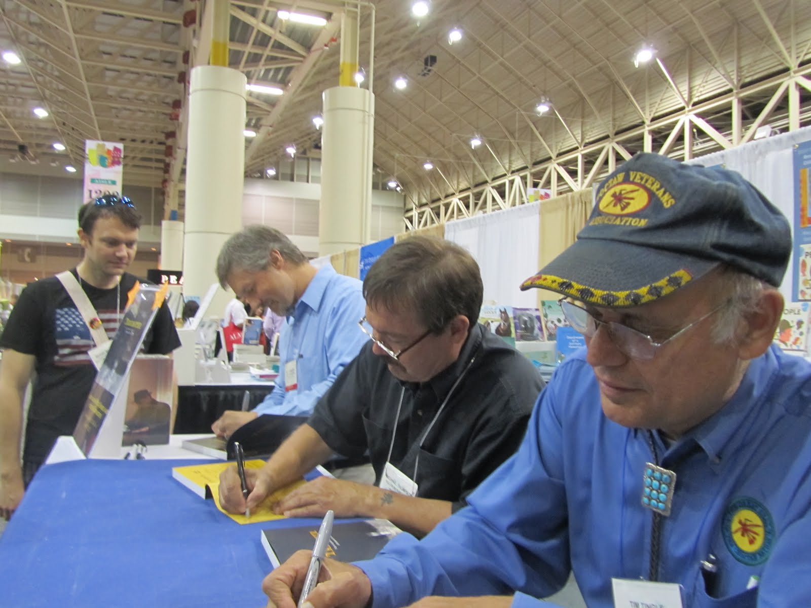 contributing writers Michael Thompson (center) and Tim Tingle (right) at a Trickster signing at the Consortium booth.