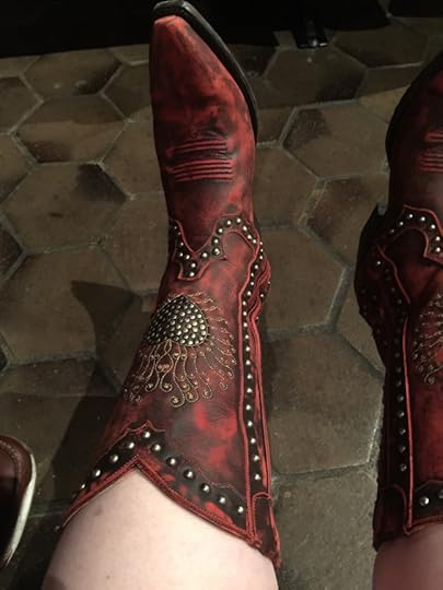 And, then we, or I should say I, went boot shopping. It goes without saying that I have a boot obsession. I love boots, have many pairs but I do not have a genuine cowboy pair or a red pair. So, the search began. I tried on pair after pair until I was overwhelmed. Did I want mid calf? Higher? Sequins? No Sequins? My head was spinning but then the nice man at Trails West directed me to a pair of studded red/black wine boots. It was literally the last pair of those Dan Post boots they had. And, they happened to be my size. So, when the shoe fits. . .