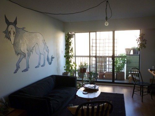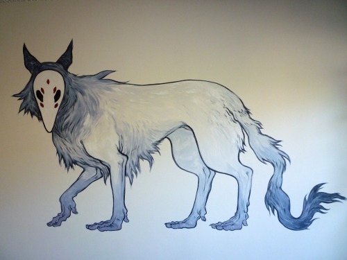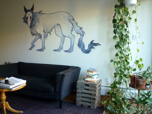 I’m back from my island. Somehow it seemed natural that, on my return, I should discard every other plan and paint a giant monster/dog/wolf/beast/thing (with creepy humanoid hands) on my wall.
