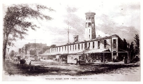 The first Jefferson Market, at the northwest corner of Sixth and Greenwich Avenues, got its start in 1833; it was a one- and two-story collection of stalls with a wooden cupola on top that served as a fire watchtower (above).