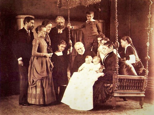 Louis Comfort Tiffany, far left; Charles Tiffany is in the center holding Louis’ kids in 1888The mansion, completed in 1885, was a 57-room showstopper that dwarfed its few neighbors. There was another unusual aspect to it: the gigantic house was actually three separate residences for separate Tiffany family members.