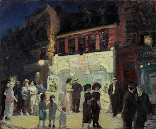 The show outside the theater is the focus here. The feature on the marquee, “A Romance in the Harem” promises “lurid entertainment and capitalizes on the ‘Orientalism’ craze—Western fascination with exotic Eastern cultures,” explains the Toledo Museum of Art, which has this painting in its collection.